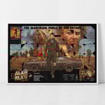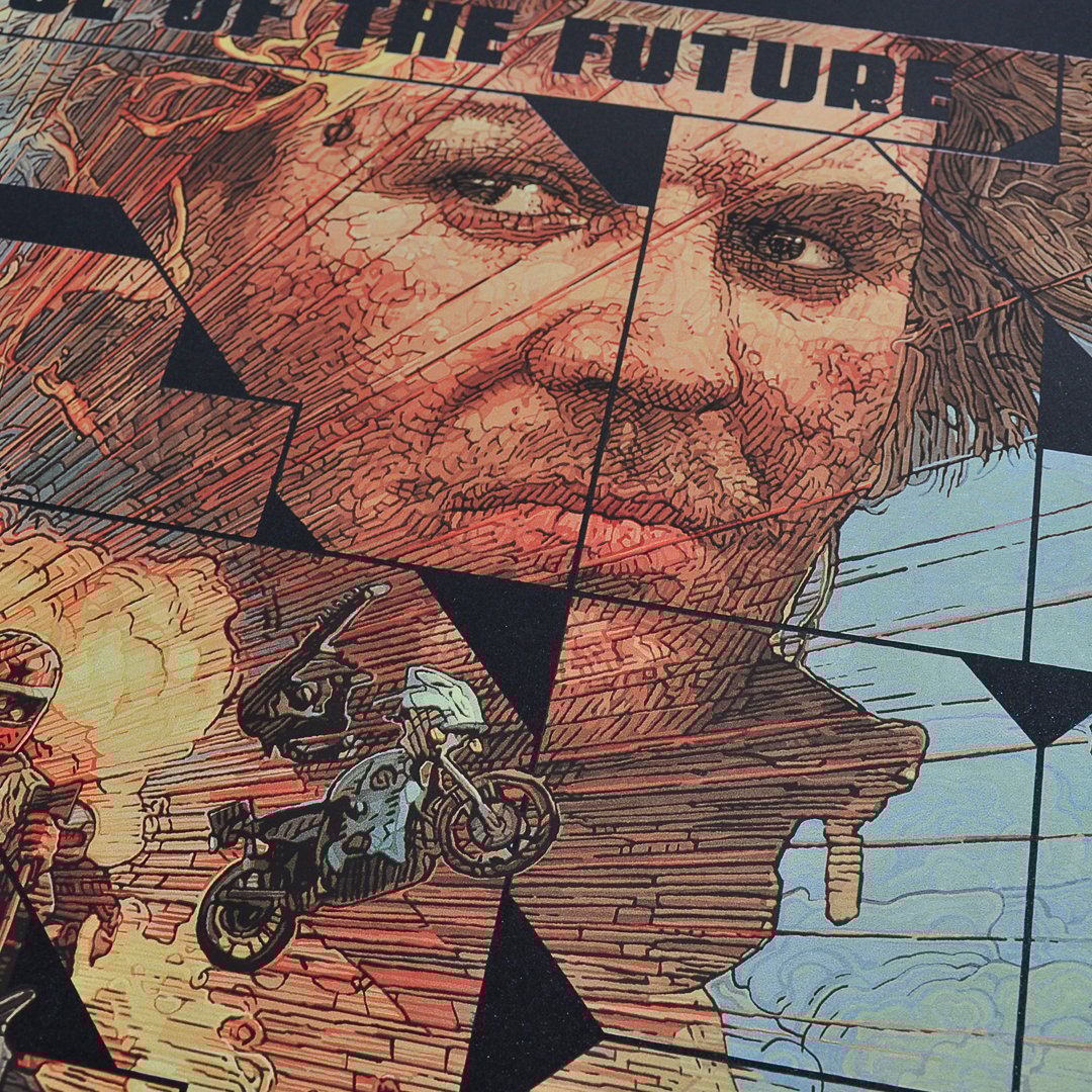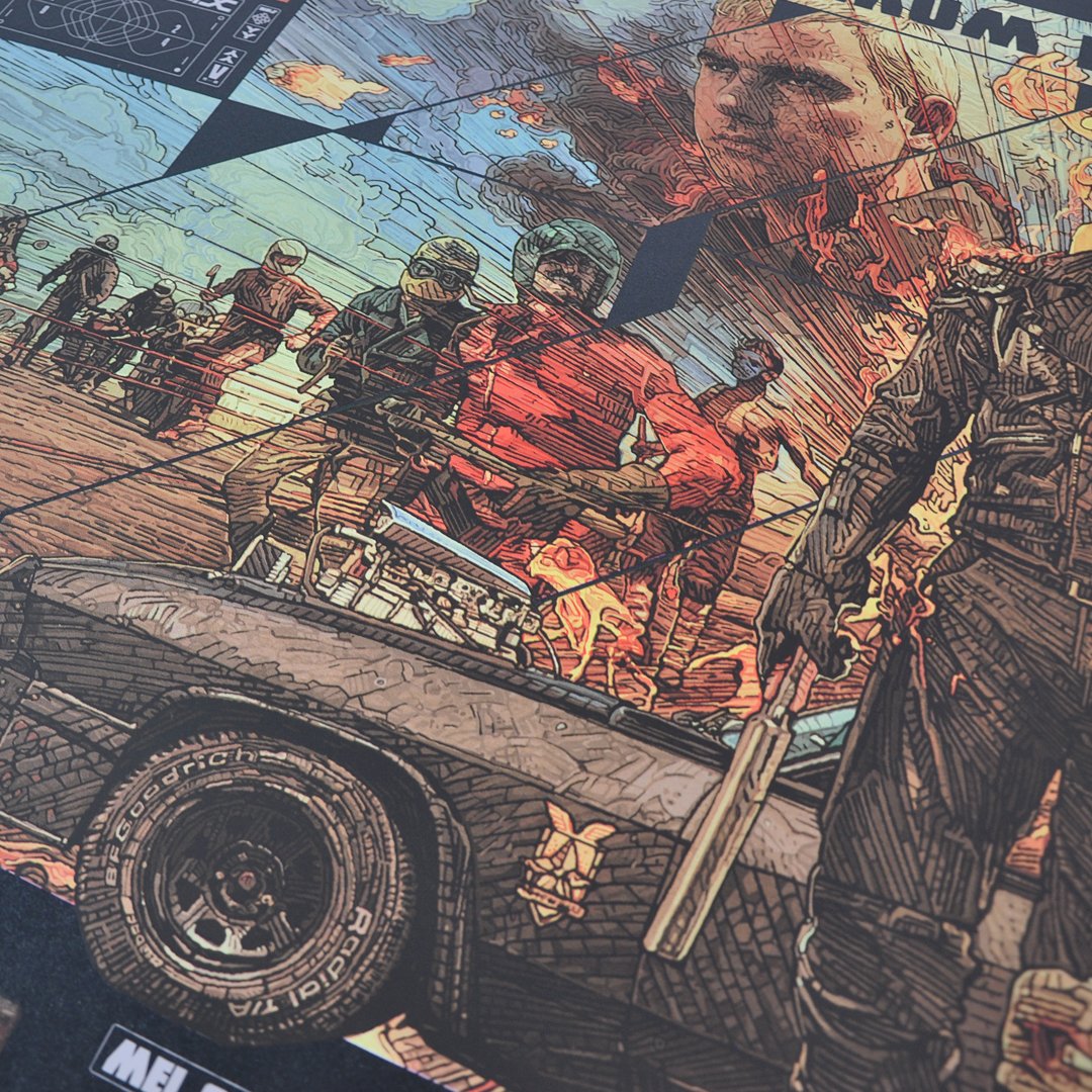 Screen print inspired by 1979 Australian action film directed by George Miller and written by Miller and James McCausland from a story by Miller and producer Byron Kennedy.