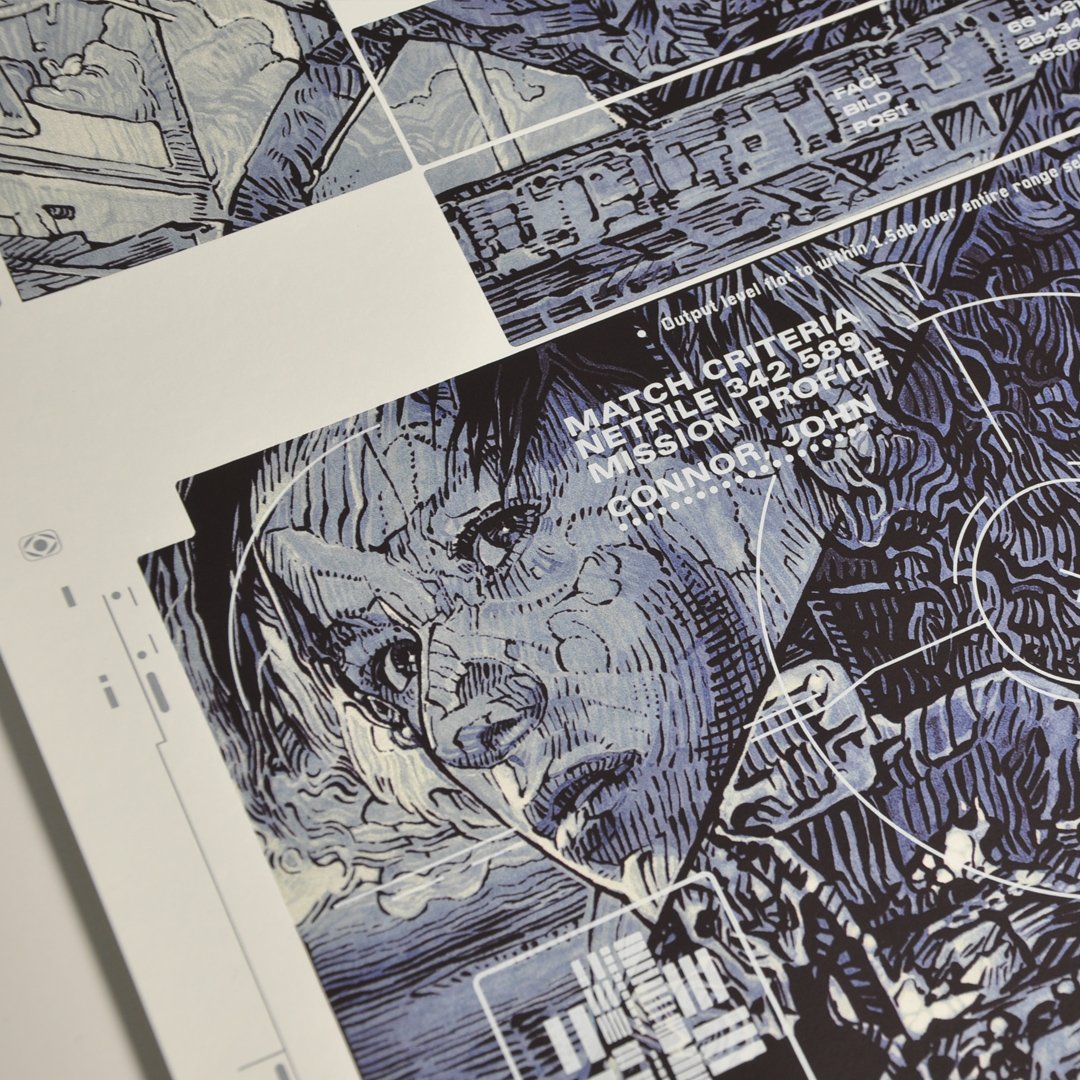 Silk screen print inspired by 1991 action classic The Terminator 2: Judgment Day written & directed by James Cameron, starring Arnold Schwarzenegger, Linda Hamilton & Edward Furlong.