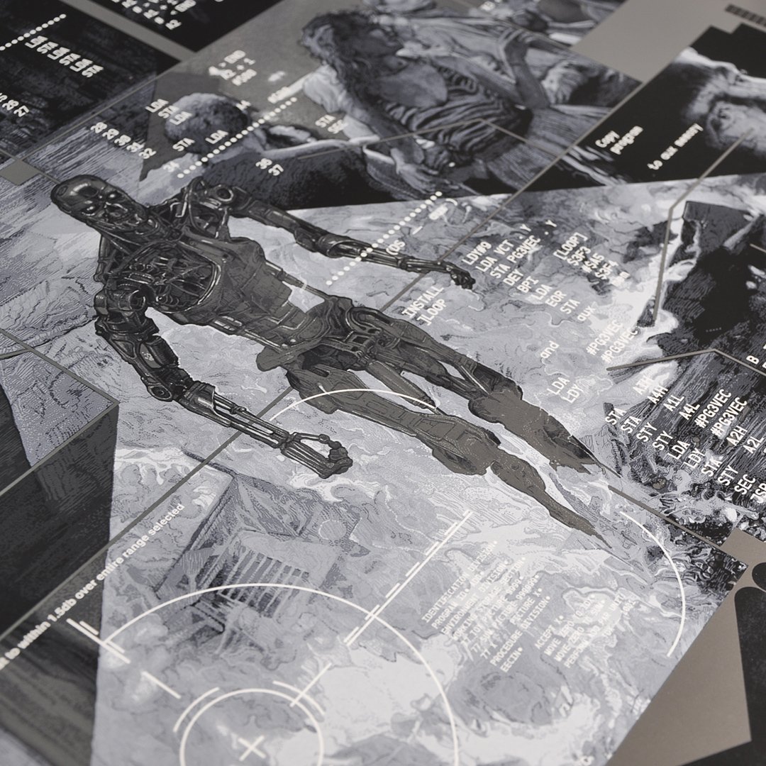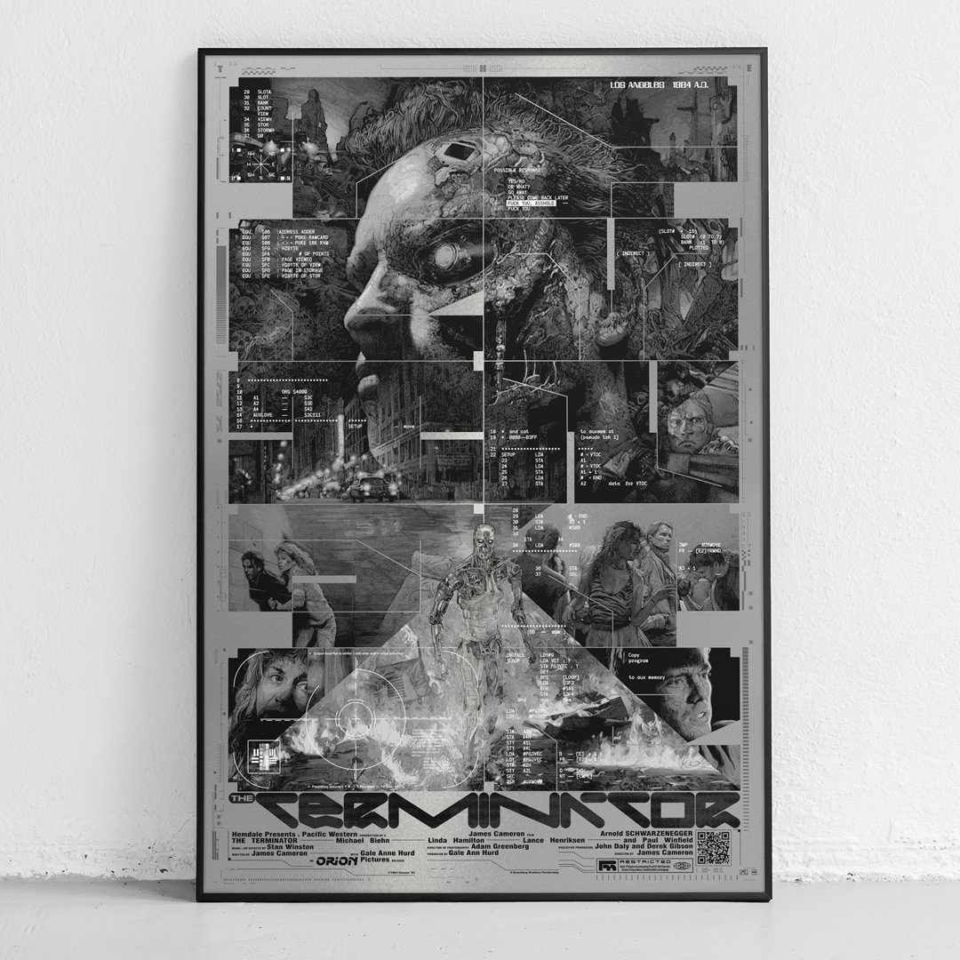 Print inspired by 1984 classic neo—noir The Terminator written & directed by James Cameron, starring Arnold Schwarzenegger, Linda Hamilton & Michael Biehn.